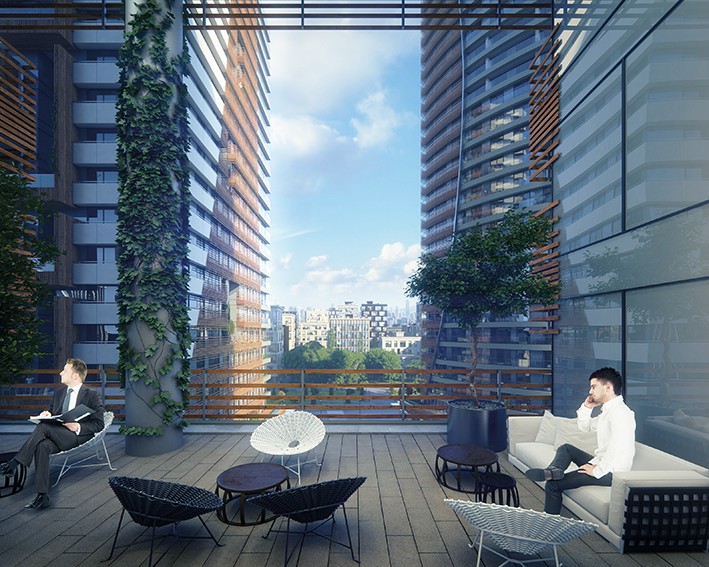 Podyumda yapılan geri çekilmelerle, farklı büyüklüklerde terasların oluşturulması, ek olarak podyumda oluşturulan bu alanlar blok dahilinde ortak yeşil alan kullanımı sağlanmıştır. Yapılan kütle hareketleri aynı zamanda binaların dinamik mimari dilini oluşturmaktadır. Blok yüksekliği maksimum 80 m olup, yerleşimleri birbirlerini rahatsız etmeyecek ve manzaraya en iyi şekilde yönelecek şekilde düzenlenmiştir. Hem manzara, hem mevcut park alanı, hem de ortak meydan ve yeşil teraslar bu konumlanma da belirleyici olmuştur.