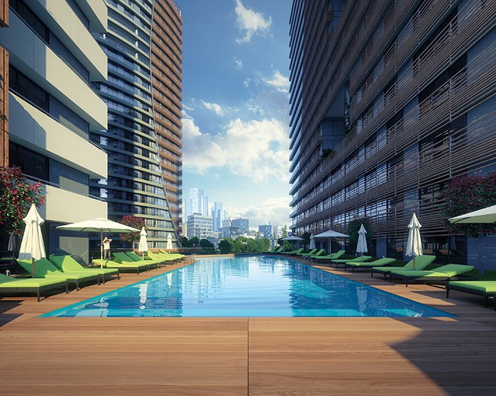 Podyum üzerinde açık havuz alanı, güneşlenme terası ve yeşil alanlar düzenlenmiştir. Podyum altında ise; 34 adet farklı büyüklükte ticari alanın yer aldığı 2 kat bulunmaktadır.Ticari alanların önünde geri çekilmelerle oluşturulan teras alanları ve 1560m²’lik meydan alanı dükkanlara ayrı bir değer katmaktadır.