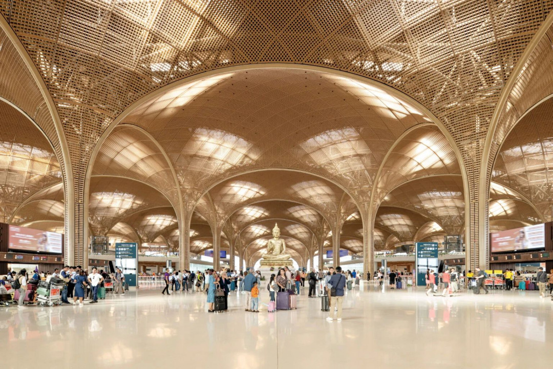 Phnom Penh’in güneyinde konumlanan Techo International Airport, çağdaş havaalanı mimarisinin alışıldık ölçek ve gösteri dilini bilinçli biçimde geri çeken bir proje. Foster + Partners imzasını taşıyan terminal, yapıyı öncelikle bir “altyapı nesnesi” olarak değil, tropikal iklim, yerel kültür ve kamusal mekân kavramları arasında kurulan hassas bir denge olarak ele almış. Projenin ana taşıyıcı fikri, geniş açıklıklar geçen modüler çatı sistemi üzerinden okunabilir aslında. Bu üst örtü, Kamboçya’nın yoğun güneşini doğrudan içeri almak yerine filtreleyerek mekâna yayıyor. Gün ışığı, çatıdaki açıklıklar ve yarı geçirgen yüzeyler aracılığıyla kontrollü bir biçimde iç mekâna taşınıyor. Ne z ne de çok, kararında. Böylece terminal, gün boyunca büyük ölçüde doğal aydınlatmayla çalışan, yapay ışığa minimum düzeyde ihtiyaç duyan bir mekânsal kurguya kavuşuyor.