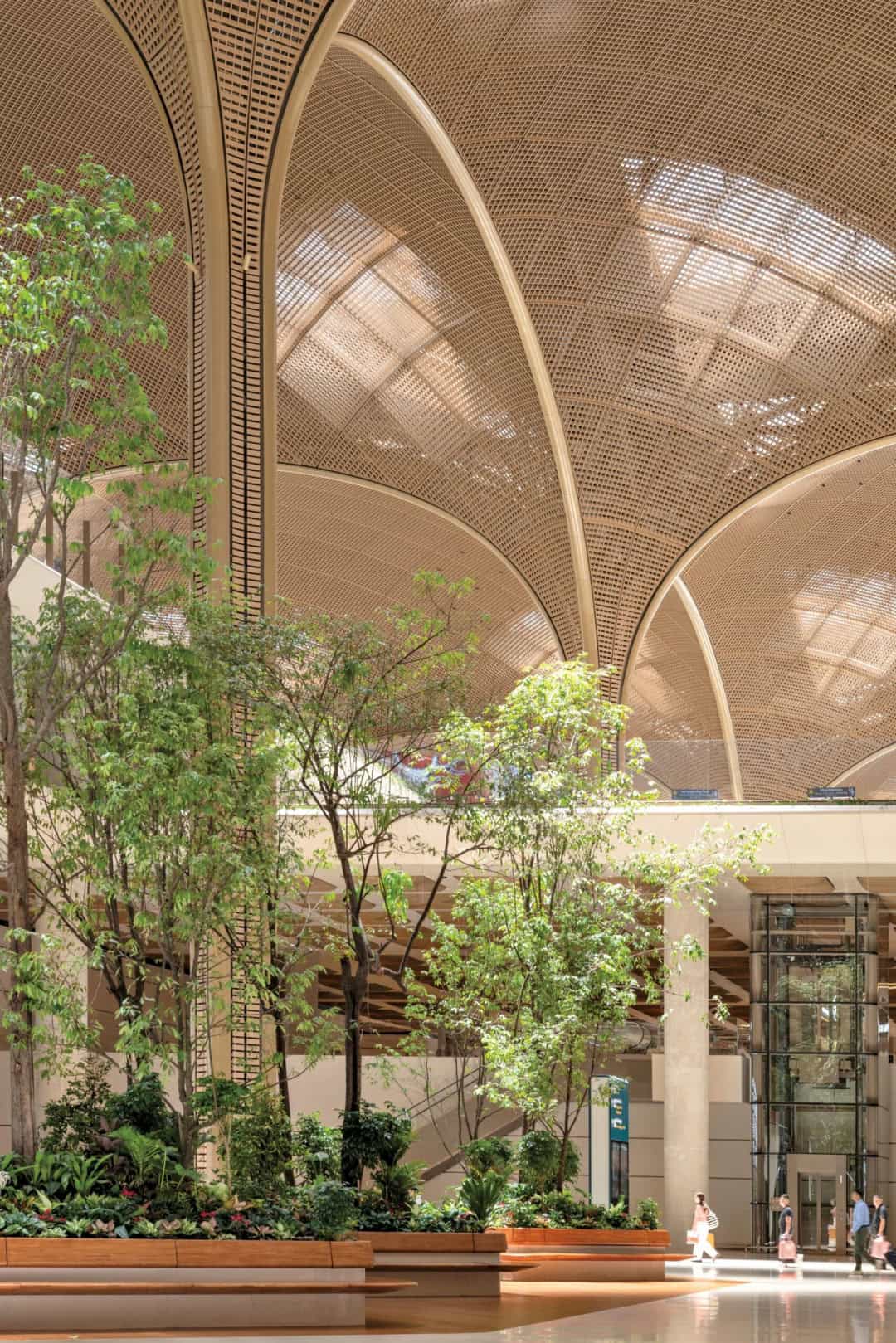 Günümüzde mimarinin temel taşlarından birini iklim oluşturuyor ve Techo International Airport, Foster + Partners’ın uzun süredir üzerinde çalıştığı iklimle uyumlu büyük ölçekli yapı yaklaşımının güncel bir örneği. Proje, havaalanı tipolojisini yeniden icat etmeye çalışmıyor; onun yerine, bu tipolojinin kaçınılmaz büyüklüğünü daha ölçülü, daha sessiz ve daha bağlama duyarlı bir mimari dile dönüştürüyor. Bu yönüyle yapı, gösterinin değil sürekliliğin peşinde olan bir altyapı mimarlığı örneği olarak öne çıkıyor. Yapının omurgasını oluşturan geniş açıklıklı çatı sistemi, tropikal iklimin sert güneşini bir tehdit değil, kontrollü bir kaynak olarak ele alıyor. Gün ışığı, çatıda yer alan açıklıklardan iç mekâna süzülürken, mekânın neredeyse tamamı gün boyunca yapay aydınlatmaya ihtiyaç duymadan çalışabiliyor. Bu yaklaşım yalnızca enerji verimliliği açısından değil, yolcunun psikolojisi açısından da belirleyici: aceleci, gergin havaalanı atmosferi yerini daha yavaş, daha dingin bir deneyime bırakıyor. İnsanlar onca telaşın içinde kendilerini pek de kötü hissetmiyor gibiler.
