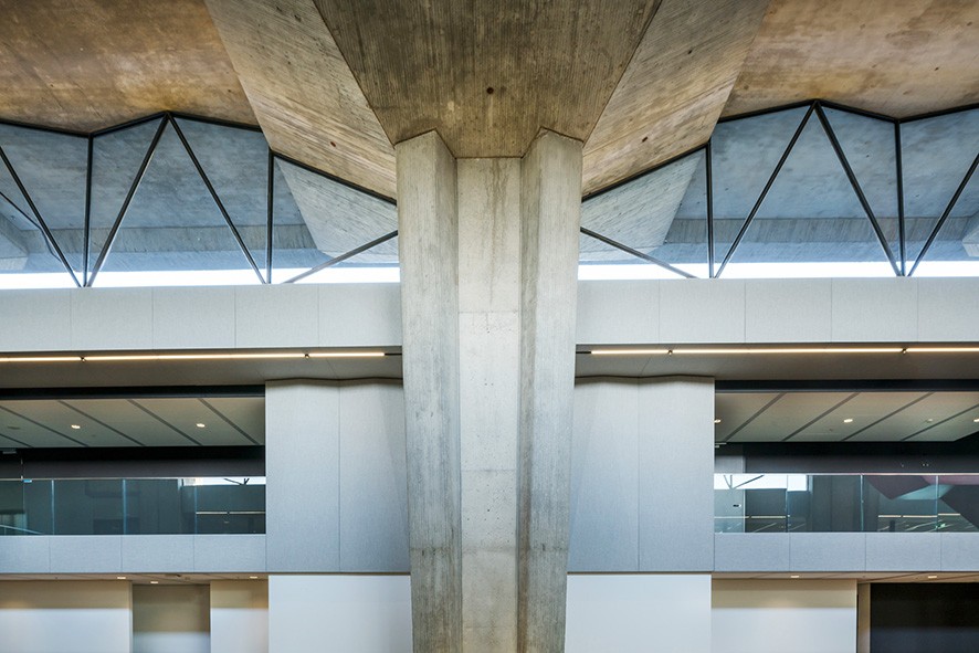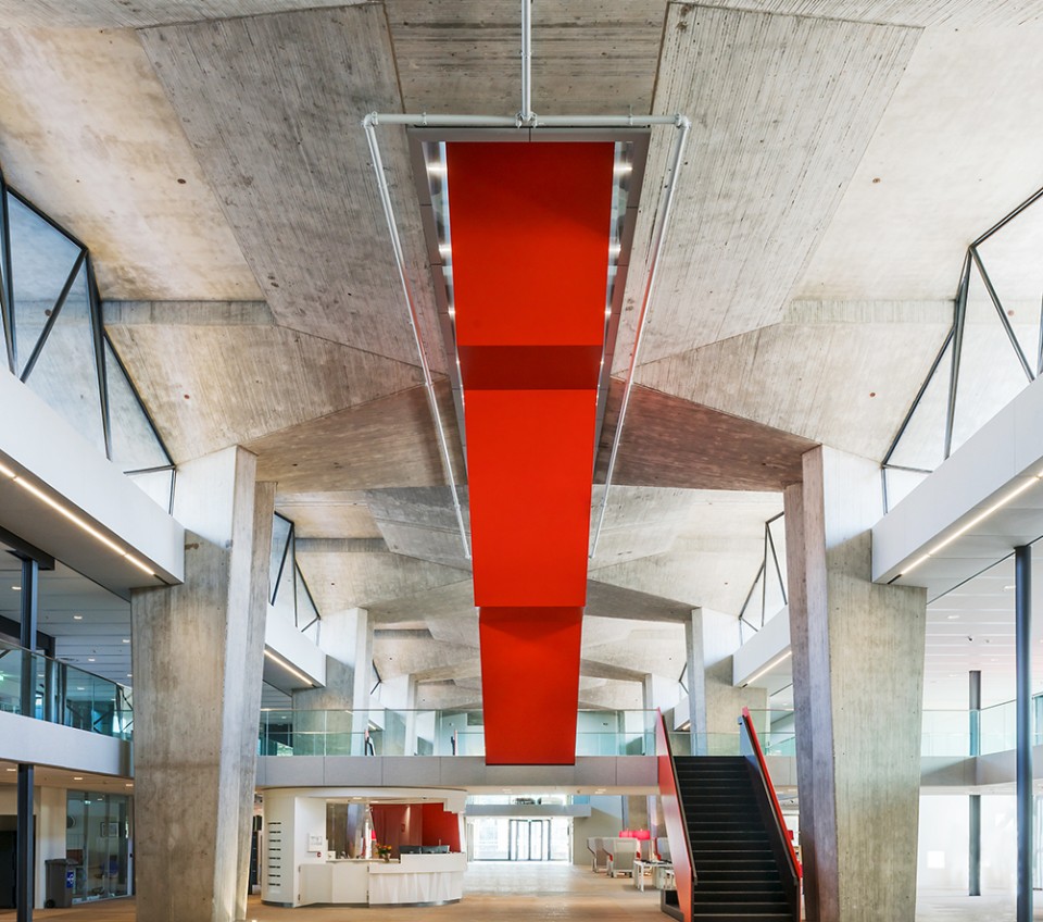 En dikkat çekici mekânsal müdahale, zemin kattan beton yapıyı geçerek binanın tepesine zikzak yaparak çıkan kırmızı merdivenlerden oluşuyor. Merdiven beton katlardaki mevcut boşlukları mümkün mertebe takip ediyor böylece yapısal etki akıllıca bir yöntemle sınırlandırılmış oluyor. Konferans salonları ve çalışma alanları gibi ortak kullanılan alanlar kırmızı merdivenin kenarına yerleştirilmiş. Böylece görünürde epeyce basit duran bir müdahale, binanın yeni kalbini oluşturuyor. Merdiven, binanın iki tarafında bulunan iki fakülteyi kampüse bağlıyor.