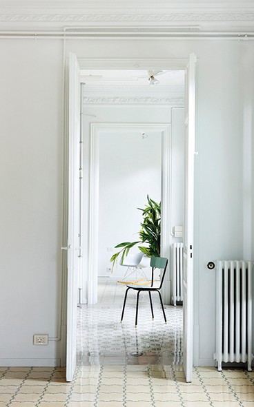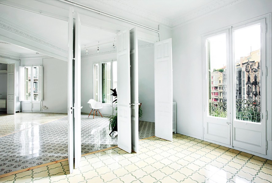 Barselona’da bir yenileme projesi olan bu apartman dairesinin oda düzeni birbirine çift kanatlı kapılarla bağlı bölümlerden oluşuyor.