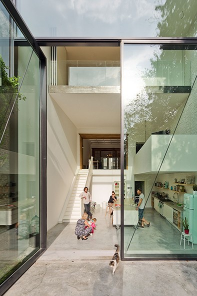 Evin eski halinde bahçe ile bağlantısı olmayan uzantılar vardı ve Mimar Pieter Peerlings ile Silvia Mertens bu uzantıları camlı mekanlar haline getirerek bahçeyle bağlamayı planladılar. Amaçları, yeni yapının üç seviyeden de bahçeyi görmesini ve doğal ışık almasını sağlamaktı. Bu amaçla camlı mekanlar olarak planlanan yeni mutfak ile yemek odası çift cam bir pencere ile bahçeye bağlanmış oldu. Üç metre genişliğinde ve altı metre yüksekliğinde yalıtılmış camla donatılmış dev kapıların her biri geleneksel menteşeden ziyade bir mil ile açılıp kapanıyor. Bu basit ama çağdaş cam sırt aynı zamanda evin arka duvarını oluşturuyor.