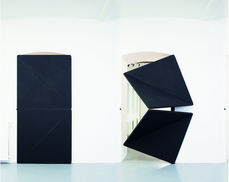 “çevirilir panel kapı” olarak adlandırılan sistem; bir çerçeveye iki menteşeyle bağlanmak yerine dört üçgen kesite bölünüp kendi içine çökerek bir dikdörtgene dönüşüyor.