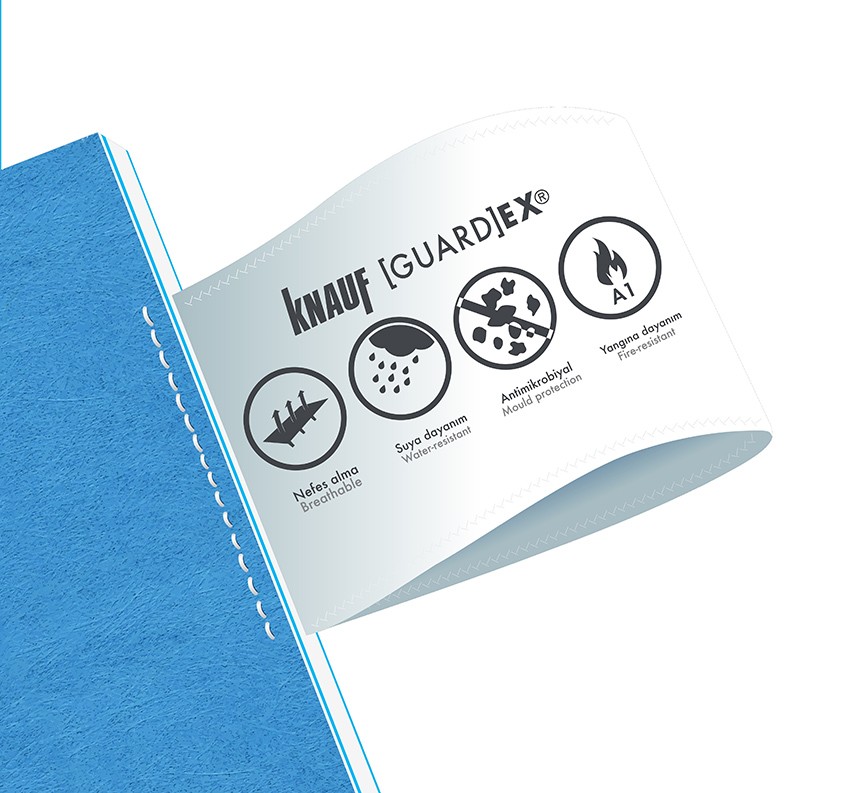 Knauf’un dış cephe kaplama altı plakası Guardex®, kışın zorlu hava koşullarında olduğu gibi, yazın ultraviyole ışınlarına maruz kaldığında da katmanlara ayrılmaya, dalgalanmalara, buruşmalara, sarkmalara karşı 6 ay üst düzey koruma sağlıyor. Guardex®, ayrıca küf oluşumunu engelleme ve yangına karşı dayanıklılık özellikleri ile de daha güvenli mekânlar yaratılmasında önemli bir rol oynuyor.