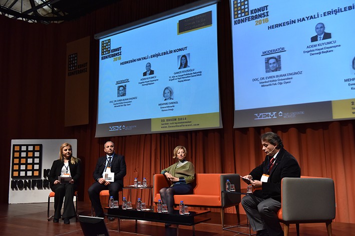 Evrenol Mimarlık Kurucu Ortağı Mehpare Evrenol ise engelsiz konutun çoğu kişinin umurunda olmadığını söyleyerek çarpıcı bir başlangıç yaptı. “Nüfusun yüzde 10’undan fazlasına tekabül eden hakiki engellileri görmüyoruz. Kanada örneği model alınmalı. Mevcut yasa şu ana kadar tarif ettiği ortamda kısmi bir açılım sağlıyor. Mesela yüzde 10 meyilli rampa yetmiyor, yüzde 6 olmalı. 90 cm ölçüsünden aşağıda kapı yapılmamalı, dönüş mesafesi bırakılmalı, asansörler daha geniş ve erişimi kolay olmalı. Bir panik anı için bütün kapılar dışarı açılmalı. Kanunda böyle bir konu da yok. Kurallar yeterli değil. Kanunlar incelikli hazırlanmalı. Büyük peyzaj alanına sahip konut projelerinde hiç engelli çocuklar için parklar yapıyor muyuz? Olanı da uygulamıyoruz, eğitimimiz eksik, mimari eğitimde engelsiz konut hakkında bir sayfa yer almıyor” sözleriyle konuşmasına devam eden Evrenol şunları söyledi: “Devletin sübvansiyon sağlaması lazım. Erişilebilir bir konut yapıyorsa yatırımcı ödüllendirilsin çünkü kapitalist bir dünyada yaşıyoruz. Bunlar tüketici için bir reklam özelliği taşıyabilir. Engelsiz yaşam evrensel bir hak. Bu farkındalık önce kendilerinde gelişmeli ve talepte bulunmalılar. Neden bana uygun beş tane daire var mı diye sormuyorlar? Nüfusun yüzde 12’sinden bahsediyoruz.”