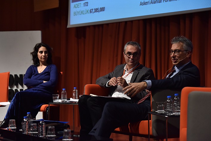 YAPI Dergisi Genel Yayın Yönetmeni Yasemin Keskin Enginöz’ün moderatörlüğünü yaptığı son oturumda başta askeri alanlar olmak üzere atıl alanların yeniden değerlendirilmesi ve konut piyasasına etkisi konuşuldu. Çevre ve Şehircilik Bakanlığı’nın 326 bin 200 hektarlık bir askeri arazi olduğunu, 11 bininin İstanbul, 7 bininin Ankara’da olduğunu hatırlatan Enginöz “Toplam sayı 195 adet. Kent içinde kalanları 172, orman alanı içinde kalanlar 23 tane. Bu arazileri konuşurken bugün şehirde nasıl konumlandıkları üzeninden bir bakış geliştirmenin doğru olduğunu düşünüyoruz. Batı’da üsler eğer donanma ise sivil havacılığa ya da taşımacılığa dönüşüyor veya fuar alanı veya sinema platosu olarak kullanılıyor” dedi.