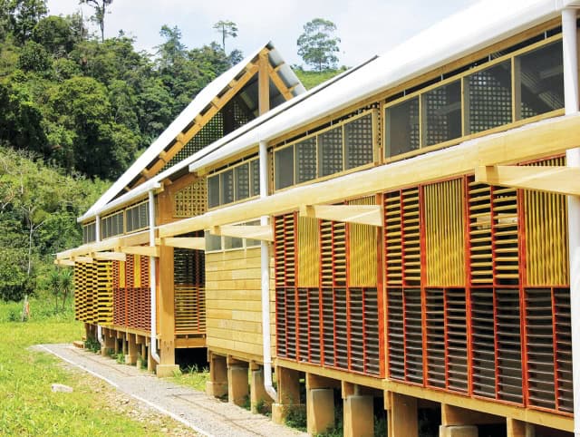 Materyalizmin büyük şehirler ya da metropoller kadar yaygın görülmediği bu gibi bölgelerde binaların çok farklı göründüğü ve tasarlandığı, malzemelerin yerel ve doğal olduğunu, ihtiyaçların çok daha mütevazı olduğunu gözler önüne seren bir eğitim yapısı Käpäcläjui. Projenin tasarım aşamasında inşaat firmasının da tercihi olan malzeme seçeneği ahşap, teknik olarak inşaya uygunluğu konusunda yerel ağaçlar üzerine araştırmalar yapıldı ve en uygun olan seçildi. Hem tasarımı hem de inşası süresince yapının çevresi ve iklimi gözetildi.