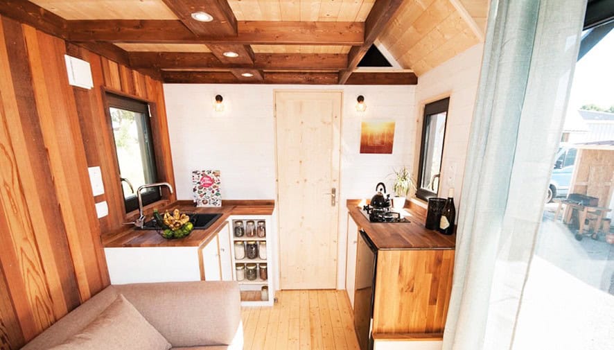 Sahipleri Nathalie ve Sebastien’ın isteklerine göre özel olarak inşa edilen Ostara, dışarıdan büyüleyici ladin bir kutuyu andırıyor. Rustik görünümlü ladin kutu Ostara, geniş bir Fransız kapı ile aydınlanmış bir oturma odasına açılıyor. 1.8 metre uzunluğundaki geniş bir kanepe, oturma odasının odak noktasını oluşturuyor. Minik evin sol tarafında küçük bir kitaplık, odun sobası ve üç kişilik bir yemek masası bulunuyor. Oturma odasının sağında tam boy lavabo, kiler, ocak, buzdolabı / dondurucu ve uzatılabilir ahşap tezgahlı mutfak bulunuyor. Sağ tarafta ise duş ve kompost tuvalet konumlanıyor. Üst katta, evin çatı katı alanında ise, 140 cm x 190 cm yatak odası bulunuyor.