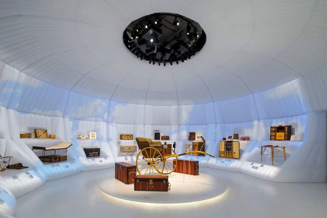 Küratörlüğünü sanat tarihçisi Florence Müller’in üstlendiği serginin mekânsal kurgusu, OMA New York ofisinden Shohei Shigematsu’nun imzasını taşıyor. Sergide Louis Vuitton’un 170 yıllık hikâyesi, merkeze bavulların koyulduğu bir sahnelemeyle aktarılıyor. Girişte yer alan Trunkscapes yerleştirmeleri, markanın simgesi haline gelmiş bavulları mimari ölçekle servis ediyor. Beş katlı atriyumda asılı duran 12,5 metrelik dev bavullar, geleneksel washi kağıdıyla kaplanarak adeta ışık saçan fenerlere dönüştürülmüş. Bir diğer enstalasyonda ise 138 vintage bavul, küresel bir kubbe formuna yerleştirilerek, cam zeminde yansıtılarak dünyayı anımsatan etkileyici bir atmosfer yaratılmış.