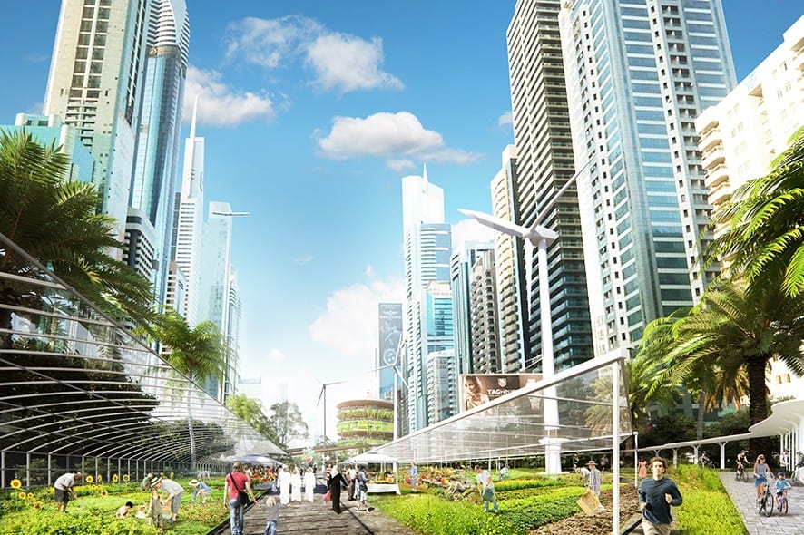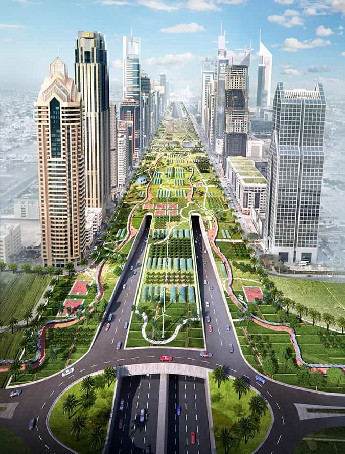Toronto ve Dubai merkezli Machou Mimarlık Grubu, Dubai için dünyanın en uzun kentsel tarım parkını tasarladı. Şehrin en işlek ve önemli yolunu bir eko vadisine dönüştürmek için tasarlanan proje, işlevsel kamusal alanların ve sürdürülebilir dış mekânların olmamasına tepki olarak geliştirildi. Şeyh Zayed Yolu’nu yeniden planlayan proje, Dubai’nin ana ulaşım arteri ve diğer şehirlerle birincil bağlantısı üzerinde odaklanıyor.