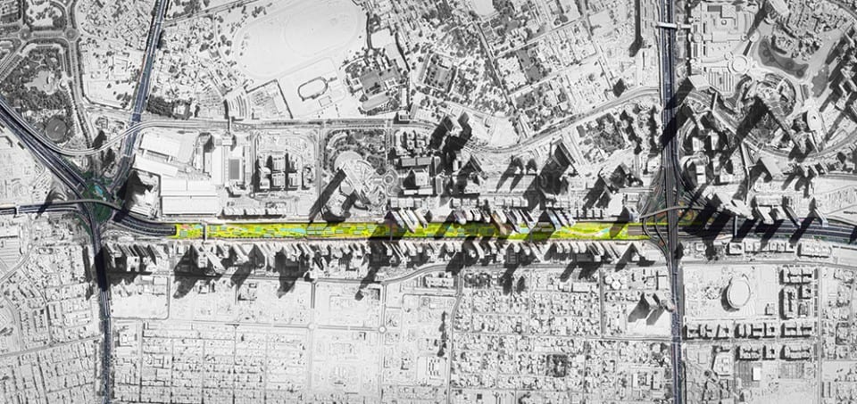 Kentsel kitle geliştikçe Şeyh Zayed Yolu yıllar içinde dönüşerek, giderek büyüyen, şehri ikiye bölen geniş bir araç nehrine benzedi. Machou’nun projesi, yolu yer altına alarak 25 km uzunluğundaki, 350 hektarlık alanı, birinci sınıf kentsel tarım arazisine ve sosyal sermaye gelişimini yönlendirmek, ekonomik değer sağlamak ve sürdürülebilir büyümeyi desteklemek için kamusal alanların katalizörüne dönüştürüyor.