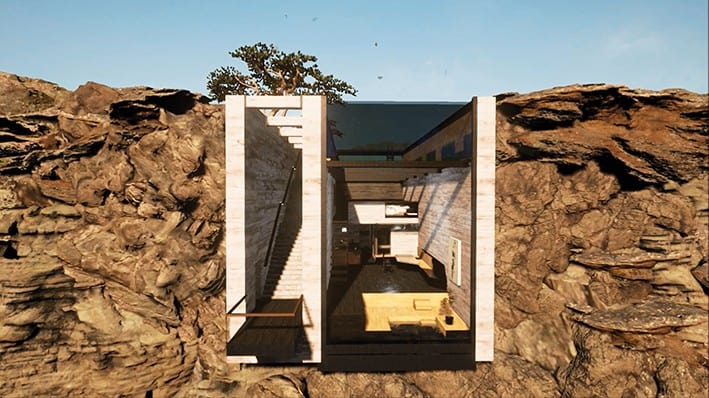 OPA, bu sıra dışı tasarımda malzeme seçiminde oldukça ihtiyatlı davranmış. Ham çimento yüzeyler ile ahşap ve demirden oluşan levhalar projenin diğer kısımlarını oluşturarak ana merdivenler etrafında açık bir yaşam alanı ile asmakat zemin üzerine bir büyük yatak odası ortaya koymuş. Tamamen çimento dökümden yapılı yataktan inanılmaz su manzaraları görmek mümkün. Bütün tasarım tabiat ve yüzme havuzu ile soğutulmakta ve tasarımın uygunluğu sayesinde tepeden sökülen büyük kayalar haricinde doğaya herhangi bir olumsuz etkisi bulunmamakta.