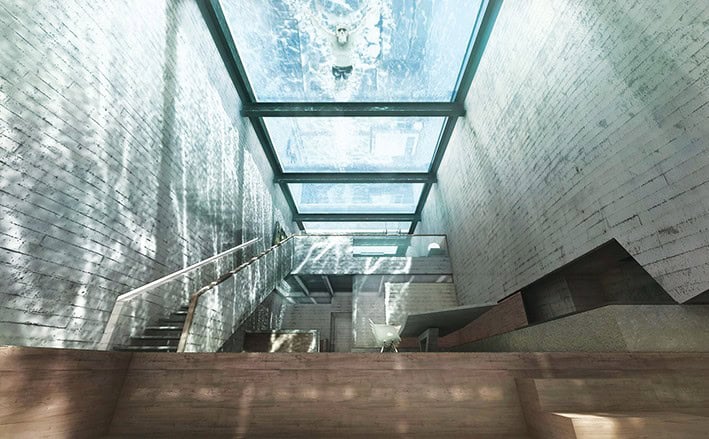 Güçlendirilmiş cam ve sudan oluşan bir çatıya sahip olan ev yürek hoplatan dizaynıyla modern ve etkileyici bir konut projesi. Ayrıca toprağa gömülmesine rağmen suda kırılarak gelen gün ışığını gün boyunca eve dolduran havuz, sakinlerine ilginç bir yaşam alanı deneyimi yaşama imkanı vermekte.