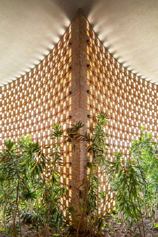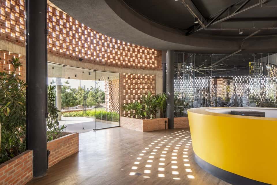 Bu desen cepheye üç boyutlu bir boyut ve hacim getiriyor, ilginç bir ışık ve gölge efekti yaratıyor. İkinci katman, bölgenin iklimine adapte olan ve hoş bir mikro iklimlendirme yaratılmasına katkıda bulunan bitki örtüsü türleriyle bir iç bahçeyi barındırır. Üçüncü ve son kat, gerekirse spor salonunun mekanik olarak soğutulmasını sağlayan döner şeffaf cam çerçevelerden oluşuyor.