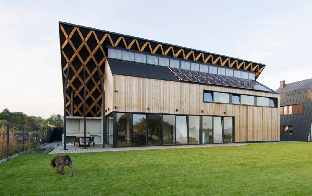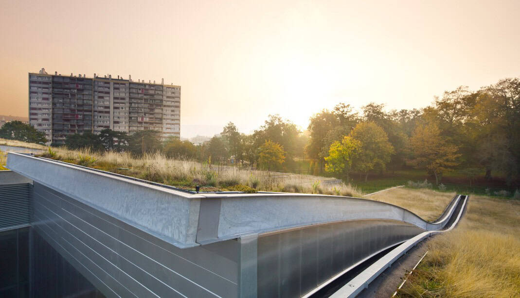 Yeşil çatı 45 derecelik bir eğime sahiptir ve binanın imza unsuru, çapraz elemanlar ve çatı kenarlarında alttan kesmeler bulunan yapıştırılmış laminat yapıdır. Sadece dışarıya değil aynı zamanda binanın içine de nüfuz eder. Yeşil çatı tasarımı başarılı şekilde entegre etmiştir.
