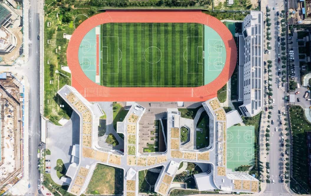 Çatıları dalgalı yeni açık ‘zeminler’ haline gelen peyzajlı bahçeler şeklini alıyor. Üst binanın çatısı okulun 36 sınıf öğrencisi için 36 parselden oluşan organik bir çiftlik olarak tasarlanmış ve öğrencilere tarım tekniklerini öğrenme fırsatı sunuyor. Proje sürdürülebilir mimariyi başarıyla uygulamış.