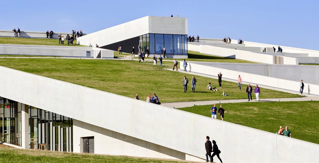 Moesgaard Müzesi çatısının etrafında tasarlandı. Yeşil çatısı, avluları ve yer altı terasları ile müze, ziyaretçilerini yeni ve alternatif sergilere davet ediyor. 16.000 m2’lik müze, Aarhus’un güneyinde, Skord’un inişli çıkışlı tepelerinde yer alıyor. Çim, yosun ve çiçeklerle büyümüş eğimli bir çatı manzarasına sahip bina, denizden bile öne çıkan görsel bir simge görevi görüyor. Dörtgen çatı, peyzajın dışında büyüyor gibi görünüyor ve yaz aylarında piknikler, barbeküler, konferanslar ve geleneksel yaz ortası şenlik ateşleri için bir yer sağlıyor. Yeşil çatı ve mimari müzede buluşmuştur.