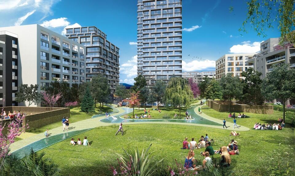 Öte yandan projedeki otoparklar tek bir meydanın altı ve bina altlarında konsantre edilerek avlu alanlarındaki doğal toprak korunmuştur. Bu karar, İstanbul’da arazilerin tamamen kazılıp otopark yapıldığı bir dönemde radikal görülmelidir. Arazinin yarısından fazlası doğal toprak olarak korunmuş, kökü toprağa ulaşan fidanlar ekilmiştir. Peyzaj alanlarında büyük göletler, anlamsız yer kaplayan süs ve dekorasyon elemanlarından ziyade, fonksiyonel ve kullanışlı alanlar planlanmış, bunlar uygun bitki örtüsü ile kaplanmış, su tüketimi minimize edilmiştir.