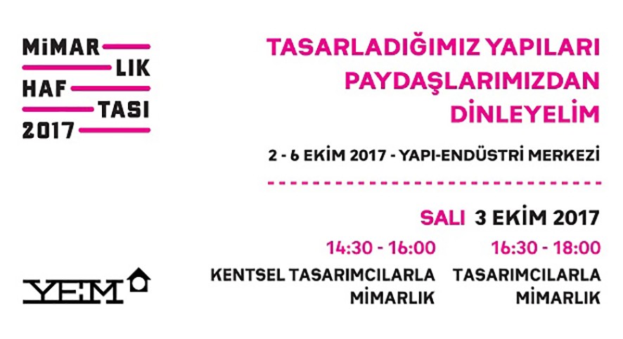 Yapı-Endüstri Merkezi (YEM)’in Fulya’daki ana salonunda, 2-6 Ekim 2017 tarihleri arasında gerçekleşecek olan Mimarlık Haftası etkinlikleri; ‘Eğitimcilerle Mimarlık’, ‘İşverenlerle Mimarlık’, ‘Kentsel Tasarımcılarla Mimarlık’, ‘Tasarımcılarla Mimarlık’,‘Mühendislerle Mimarlık’, ‘İnşaat Mühendisleriyle Mimarlık’,‘Yeni Teknolojilerle Mimarlık’, ‘Malzeme Üreticileriyle Mimarlık’, ‘Bir Kültür Fizik Alanı Olarak Spor’,‘“Y” Kuşağı ve Mimarlık’ başlıklı on ana oturumda yapılacak. Farklı meslek profesyonelleri mimarlığı anlatacak