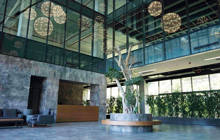Ofis hacimleri bir atriumda buluşan iki kütlede yer alır. Atnum katlar boyunca iki kütleyi birbirine bağlar. Aynı zamanda çalışanların bir araya geldikleri bir dinlenme mekanı ve balkona dönüştüğü katlarda da çevredeki tarihi yapıların görülebildiği seyir teraslarıdır.