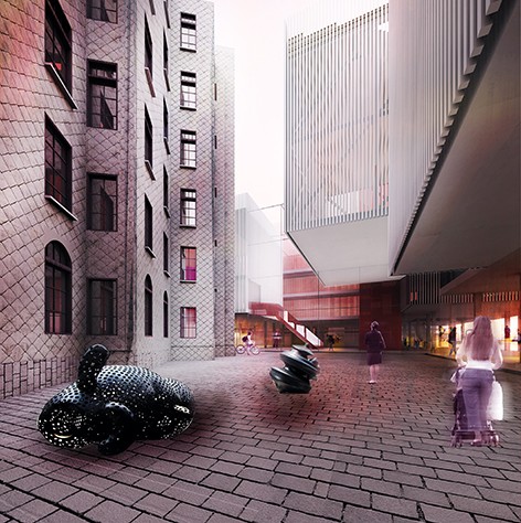 Yapı adasındaki irili ufaklı eski (mevcut), yeni yapıların arasındaki avlu bir kentsel aralık oluşturur. Çevredeki sokaklardan kıyıya yönelen yaya hareketi, yapılar arasındaki dar sokaklardan geçerken bu kent aralığında soluklanır ve yine dar sokaklardan geçerek kıyıyla buluşur. Bu geçiş ve soluklanma alanı aynı zamanda yapı adasındaki tüm yapıların sirkülasyon elemanlarının yeraldığı devingen bir geçiş alanıdır.