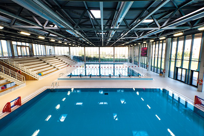Havuzun yerleşke içindeki konumlanışında en büyük özelliği, çevresi ve peyzajla kurduğu güçlü ilişki, sade ve rasyonel mimari dilinin yanı sıra, zengin ve keyifli mekan kurgusudur. Toplayıcı, bir araya getirici büyük saçağın altında transparan bir dünya sunulur öğrencilere. Yarı olimpik havuzla birlikte bir eğitim havuzunun da yeraldığı kapalı havuz mekanı açık havuzlara ve koru peyzajına bakar. Kafeterya ve üst kattaki fitness salonu ile havuz arasında görsel ilişki vardır. Yapı konstrüksüyonu, brüt beton kolonlar ve çelik çatıdan oluşur. Saydam cephe yapıyı kütlesel olarak hafifletirken, iç ve dış ortamı birbiriyle ilişkili kılar. Yapının üst girişindeki merdivenler aynı zamanda açık spor alanlarının seyir amfisidir. Soyunma odaları, antrenman salonları havuzla aynı kotta olup, kendi özel koridorlarından gerekli hijyen şartları gözetilerek havuzla ilişkilendirilmiştir.