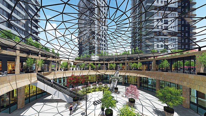 Projenin merkezinde yer alan modern yarı açık cam kubbe ile çökertilmiş bir meydan projenin merkezine konumlandırılmış olup, bu mekandan kapalı AVM’ye ulaşım sağlanmıştır.