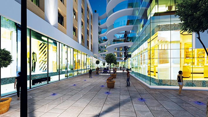 Alışveriş kütlesi çevre sokak dokusu ile birleşerek yaya sirkülasyonunu projenin bünyesine çekmesi hedeflenmiştir. Alışveriş kütlesi için oluşturulan baza yükselen yapı bloklarının insan ölçeğine indirgenmesinde ana rolü üstlenmiş olup, arkadlı yapısı ile iklimsel özelliklerden kaynaklanan olumsuzlukları konforlu bir sokak olarak kullanıcılarına sunması hedeflenmiştir.