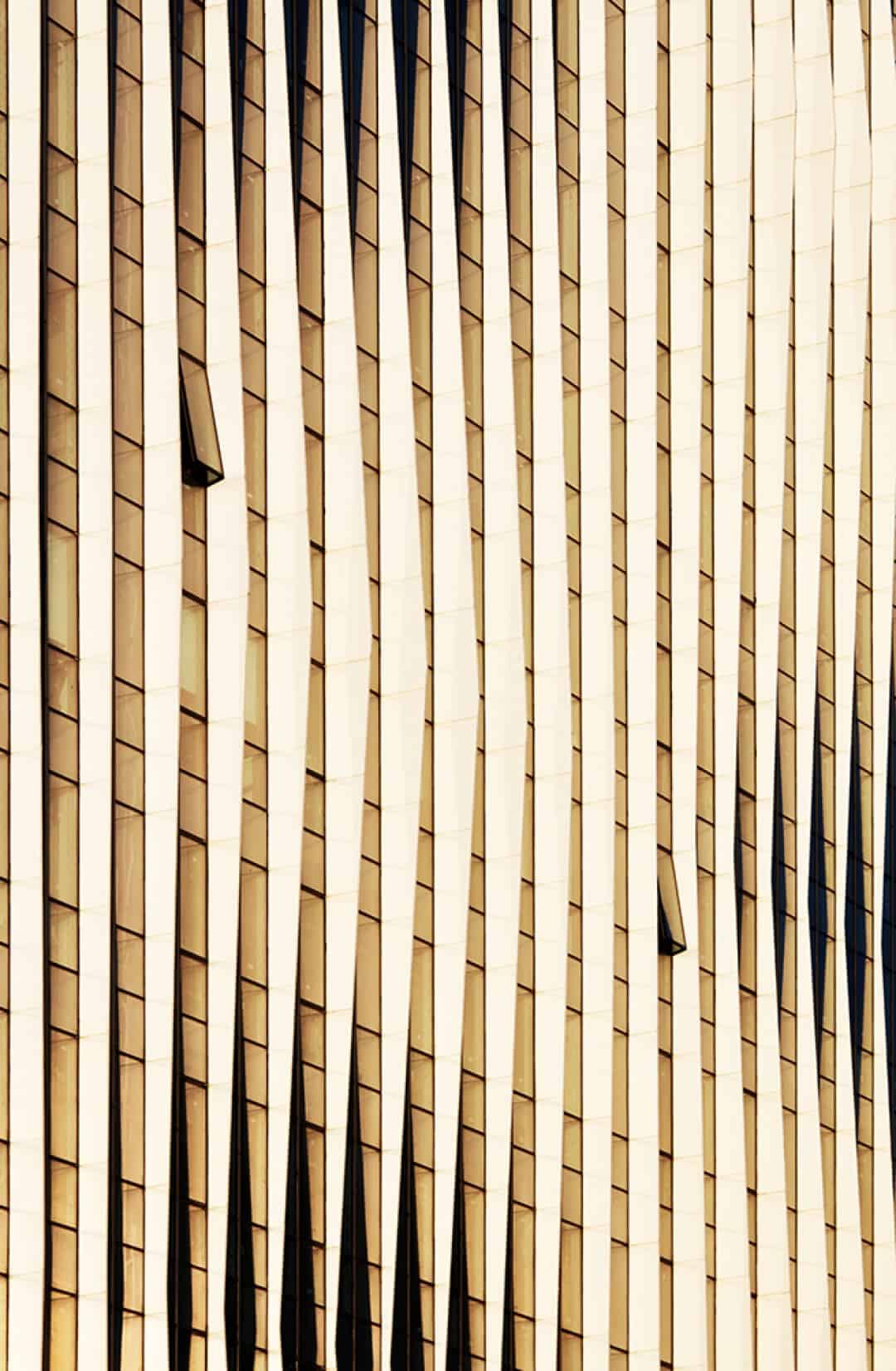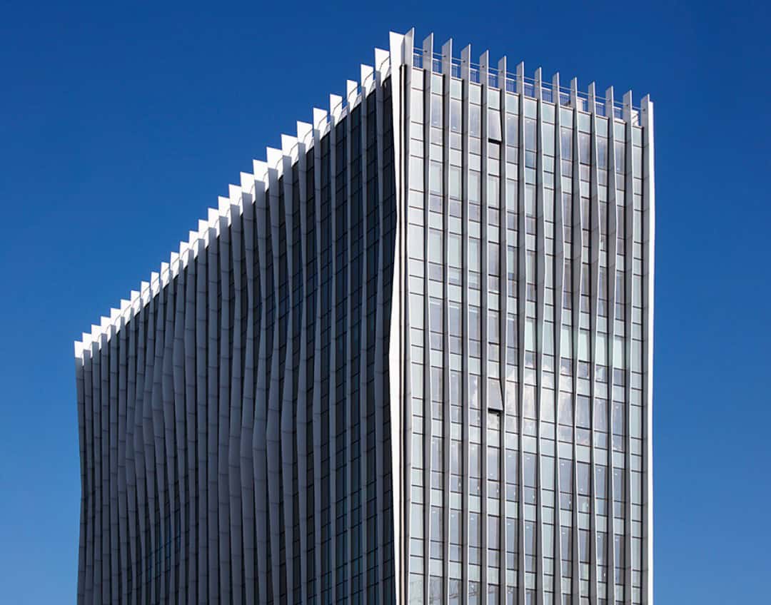 Ofis bloğu, cama dik olarak oturtulmuş, CNC kesimli alüminyum panellerle kaplıdır ve kuzeye bakar. Böylece, bina doğu-batı güneş ışığından kaçınır ancak ofis hacimlerine yansıyan hafif bir güneş alır. Alüminyum kanatlar, bina ölçeğinde ortaya çıkan bir kabartma deseni oluşturur. Bu minimalist ama güçlü cephe tipolojisi, mahalle içindeki binaya çağdaş bir kimlik kazandırır.