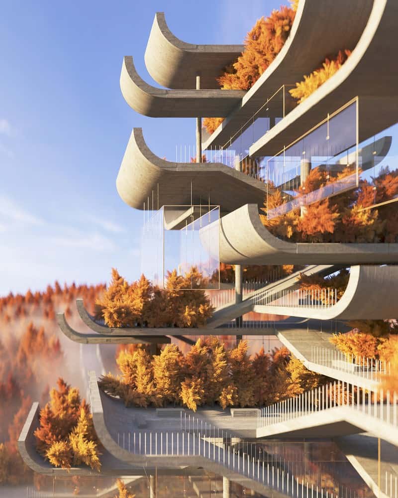 Amey Kandalgaonkar, geleneksel Çin pagodasını modernist tarzda yeniden yorumlayan projesini açıkladı. Şangay merkezli tasarımcı, kurgusal yeniden yorumlamasını, ham brüt beton, minimal süsleme ve cesur geometrik hareketler içeren bir anlayışla, Modernizm’in dokunmadığı bir yapı biçimine saygı olarak yarattı.
