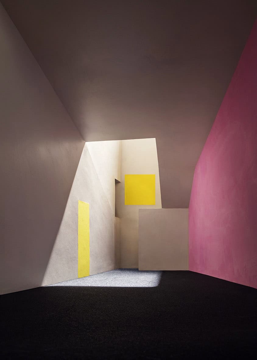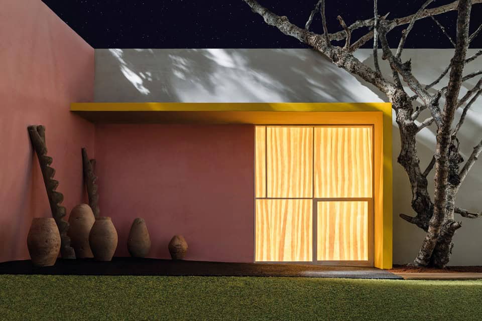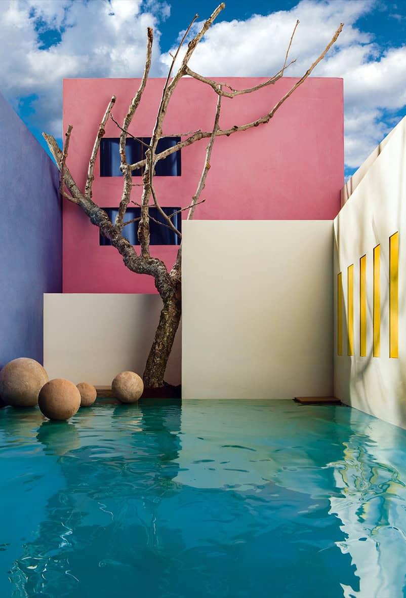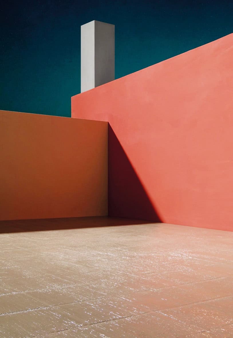 Bu yeni çalışmasında ise Casebere, Barragán’ın görkemli renk kullanımını, dramatik hafif ve