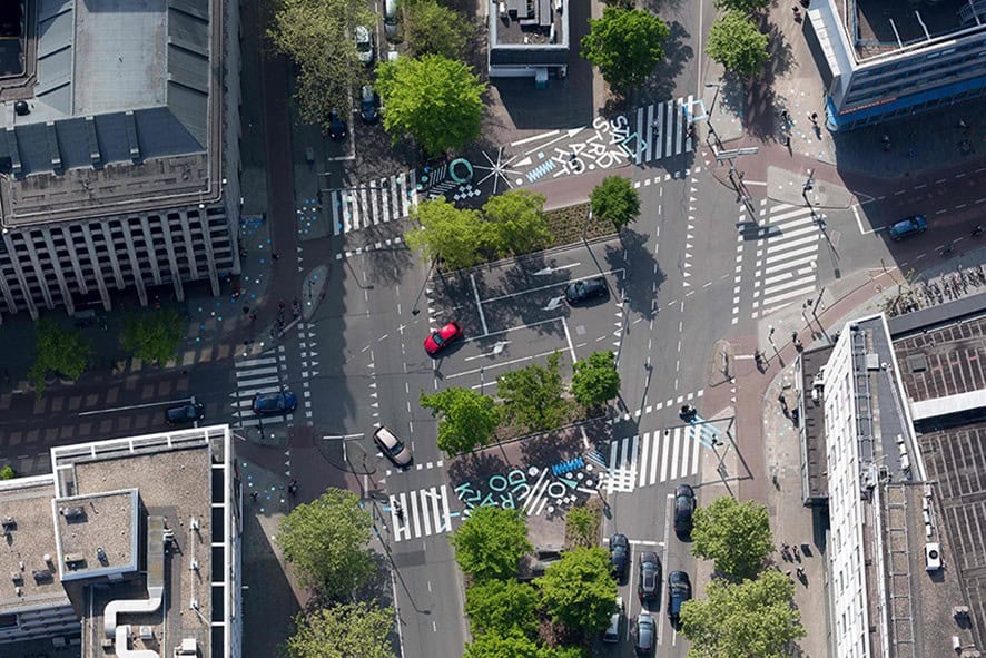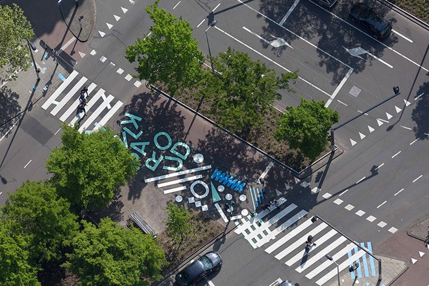 Sadece yol işçileri tarafından kullanılan elemanlarla Opperclaes, yol kavşağının farklı noktalarını birbirine bağlayan renkli bir çalışma ortaya koymuş. “Şehir yapmak yalnızca plancıların ve mimarların işi değil. Sürdürülebilir, sağlıklı, başarılı bir şehir yaşamına doğru geçiş yapmak istiyorsak farklı yaratıcı disiplinleri de bu sürece dahil etmeliyiz,” diyor yaratıcı stratejist Jorn Wemmenhove.