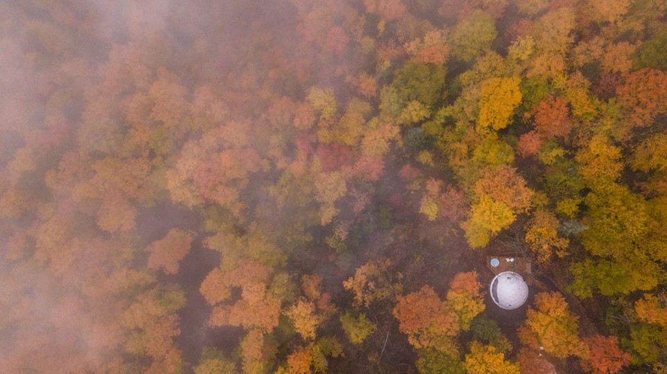 Daha büyük bir turizm projesinin parçası olan her kubbe, dağlık araziye bakan ayrı bir ahşap verandada yer almakta olup spa küveti ve açık hava terası ile tamamlanmaktadır.