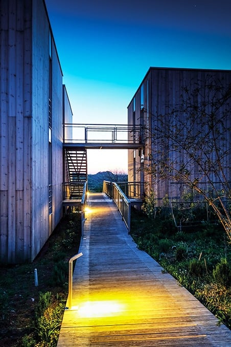 Konaklama birimleri arazinin kuzey tarafında, güneye doğal ışıktan maksimum faydalanacak şekilde yönlenerek konumlandırılmış. Hafif çelik prefabrik modüller olarak tasarlanan bu birimler kolonlar üzerinde toprağa minimum müdahale etmektedir. Böylece toprak içindeki tüm hareketlerin (su, mikro-organizma, solucan vs) sürekliliği sağlanmakta.