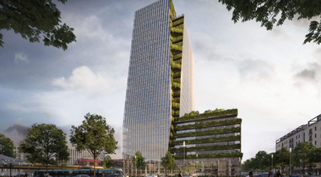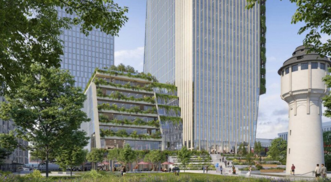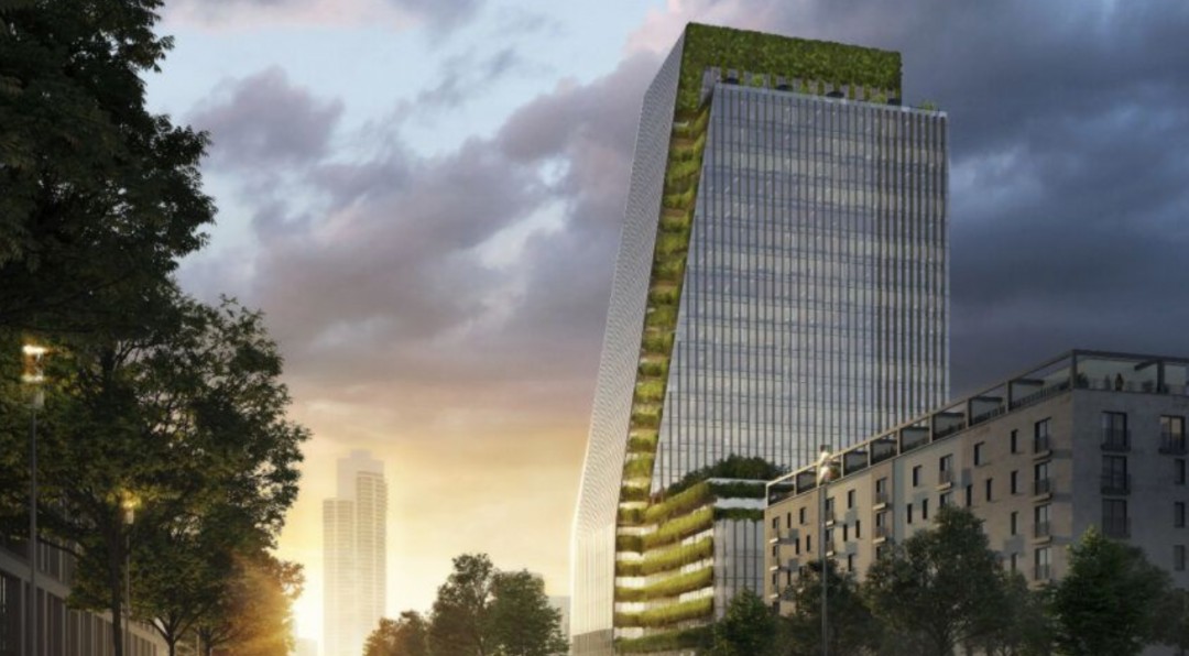 Sürdürülebilir mimari proje dikey bir yeşil bantla birbirine bağlanan kesişen iki kesik hacimden oluşuyor. Bir yandan sürdürülebilir mimari tasarım yüksek, modern dış cephesi bölgedeki diğer ticari alanlarla bütünleşiyor. Diğer taraf ise parka bitişik ve yeşil bir terasa sahip. Yeşil bir dikey bant iki binayı birbirine bağlar ve çevre ile olan bağlantıyı güçlendiriyor. Ayrıca iki farklı boyuttaki şekil kentsel bağlamda var olan farklı yapı ölçekleri arasında bir bağlantı oluşturuyor.