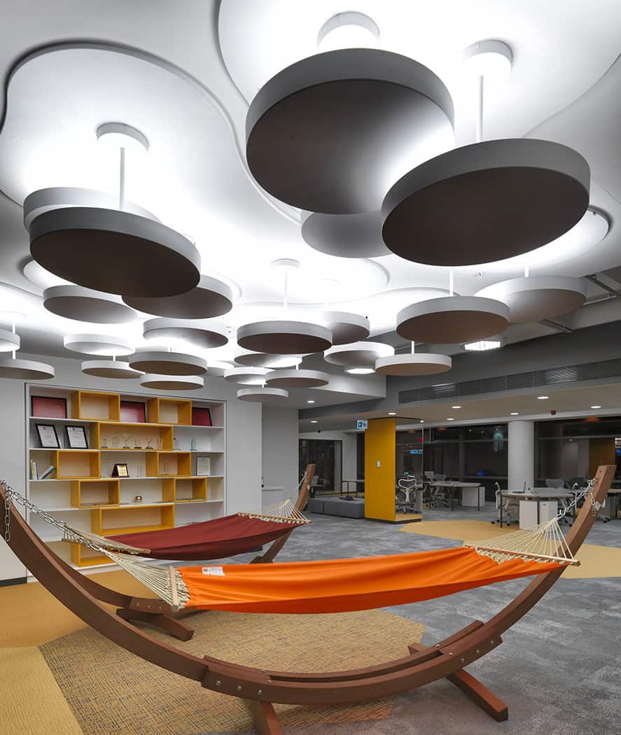 Yemeksepeti Park’ı projelendirirlerken Yemeksepeti’nin global ofis trendlerinin bir yansıması olmasına önem verdiklerini belirten Erginoğlu & Çalışlar Mimarlık kurucularından Mimar Kerem Erginoğlu, Yemeksepeti Park’ın hem çalışma hem de sosyal alanlarıyla geleneksel ofis ortamlarından ayrıştığını belirtiyor. Erginoğlu, ofisteki sosyal alanların detaylarını şöyle açıklıyor: “Yemeksepeti Park’ta hedeflediğimiz çalışanların mesai boyunca keyifli zaman geçirmelerini ve mesai dışında da diledikleri gibi birlikte hoş vakit geçirmelerini sağlayan eğlenceli sosyal alanlar yaratmaktı. Bu amaçla 10 bin m2’lik bir alanda bu sosyal alanları en etkili nasıl oluşturabileceğimiz bizim için önemliydi. Bu nedenle uyku odaları, kafe, oyun odaları, kütüphane, fotoğraf stüdyosu, salıncaklar, bilardo masası, masa tenisi, spor odası, satranç, Playstation odası gibi alanlar hem konforu hem de işlevleri göz edilerek tasarlandı. Farklı zevklere ve tarzlara aynı anda hitap edebilecek bir ortak değer olarak tasarladık.”