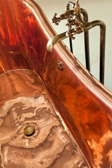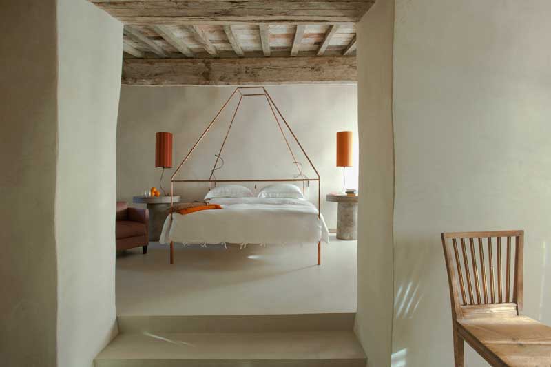 Yine yerel malzemelerden ahşap, toskana kaldırım taşı, granit ve Carrara mermeri her odaya Val d’Orcia’nın ruhunu ve mütevazi kökenini özgün bir görüntüyle sunmuş. İç mekanlardaki bu sade, tarihi ruh özel bölümlerde ve banyolarda da kendini göstermeyi başarmış. Banyo küvet ve musluklarının özellikle seçildiği bakır alaşım armatürler ortaçağ izlerine atıfta bulunurken, oda içerisinde konumlanışları hem zamanın tasarımını hem de modern mimarideki oda konseptli banyo mekanlarını fikrini yansıtmış.