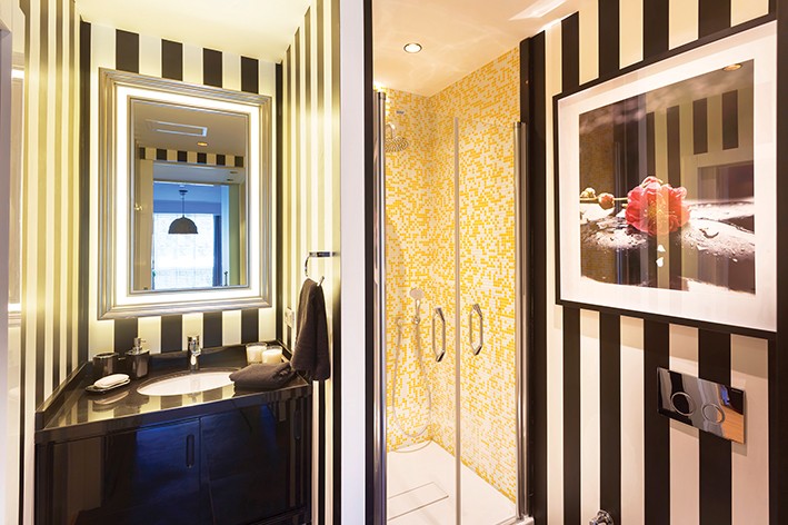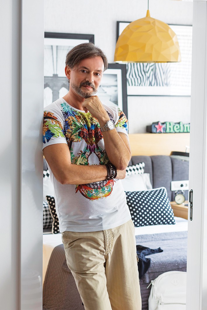 Televizyon bölümü, kütüphane ve depolama görevini alırken, ikinci katkısı da dar olan yatak odasındaki televizyon dolabı fonksiyonunu karşılamak olmuş. “O bölüm salon tarafındakinin içine gizlendi. Yatak odasında ise modern bohem bir çekim var. ‘Her şey elimin altında, tüm sevdiklerim benimle!’ duygusu söz konusu. Meşe yatak başı rafı, fotoğraf koleksiyonu sergiliyor. Siyah-beyaz desen vurgusu yatak üzerinde de enerji veriyor ama son noktayı sarı aydınlatma koyuyor. Bu arada giysi odası, beyaz gövdesi ve iyi aydınlatılmış dağılımıyla tüm dolap yükünü sahipleniyor. Banyo, siyah- beyazın vurgusunu sarı-beyazın esprili çıkışı ile kontrol ediyor. Daire girişinden banyoya yönelirken, çift taraflı Vintage ayna kaplı iki dolap arasından geçiliyor. Biri vestiyer olup diğeri çamaşır makinesi ve benzer gereçleri gizliyor,” diye detaylıca paylaşıyor iç mimar Hakan Helvacıoğlu.