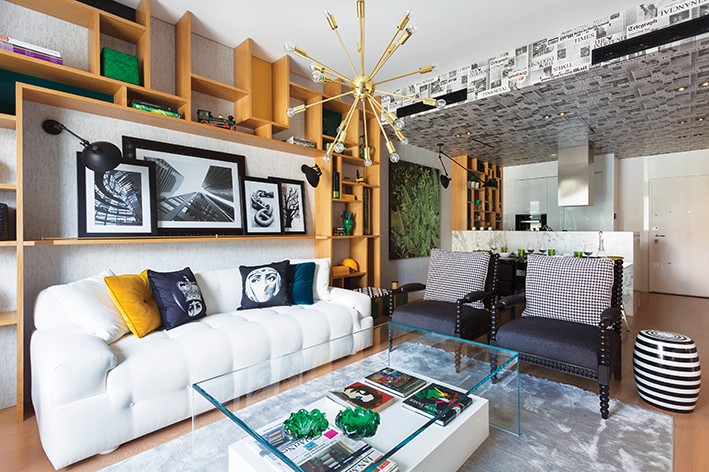 Kütüphanenin sardığı beyaz kanepenin üzerinde mekanın renklerinde yastıklar ve Fornasetti göz kırparken, hemen üzerinde siyah-beyaz mimari fotoğraf koleksiyonundan bir bölüm sergileniyor. Raflara serpiştirilmiş kişisel obje ve Vintage parçalar kütüphaneyi adeta bir sanatsal düzenleme gibi hissettiriyor. Cam sehpanın altından görünen ve kendi içinde bir duruş sergileyen Warhol ve sanat dergileri, yeşil Vintage cam objelerin sade vurgusuna eşlik ediyor. Pirinç küre aydınlatma ise tüm mekanın odak noktası olup mekanı bölen iki siyah koltuk, hem küreli hatları, hem de Pied e Poulé deseniyle salonun en kişilikli ögesi. Tüm pencereler beyaz jaluzinin geçirdiği gölgelerle giyinirken, yine siyah-beyaz desenler ile sınırlanıyor,” diye ekliyor.