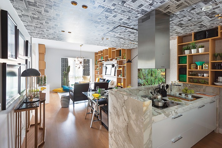 Calacata mermerle özel yapılmış mutfak ve yemek bölümü tavanı gazete kağıdı efektli, MyWallpaper’dan seçilen duvar kağıdıyla kaplanmış. Yemek masası Becara’dan, sandalyeleri özel üretim olup iki başlı özel üretim aydınlatma Dr-Light’tan alınmış.