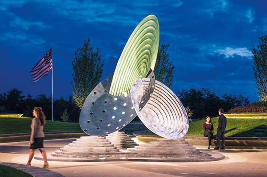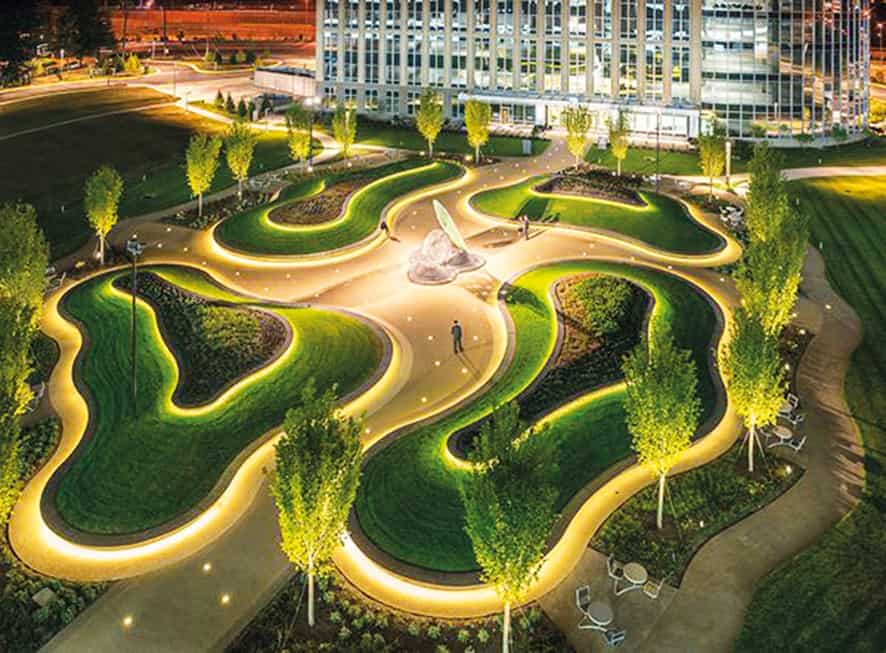 Modern şehirler büyük kamusal alanlara, kamusal alanlar da olabildiğince yeşil alanlara ev sahipliği yaparken plaza ve yüksek yapılardan da olabildiğince korunmaya çalışmakta. Topoğrafik seviyelerin sert mekanlar için yok edildiği kent düzlemlerinde mimarlar doğal peyzaja yakın alanlar yaratmayı hedeflemekte. Amerikan Peyzaj Mimarları Derneği’nden Cliff Garten Stüdyosu Virginia Eyaletinde’ ki Patriot Ridge Binasının bahçesinde ürettikleri peyzaj tasarımıyla bu vizyonu sahiplenmişler. Mimariyi, peyzajı ve mühendisliği bir araya getirmekle kalmayıp ışık ve heykel sanatlarını bu bütüncül projede öne çıkarmışlar. Yeryüzündeki höyüklerin organik formlarıyla oluşturulan alanlar yeşil dokuyu aydınlatma tasarımıyla ön plana çıkarmakta.