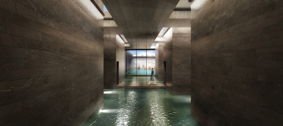 PDG Mimarlar, arazinin bir diğer verimli verisi olan termal su kaynaklarını kullanıcıyla buluşturmayı hedefleyen sosyal tesis birimlerini farklı kotlara oturtmayı tercih etmiş ve birimlerin arazi içerisine gömülerek olabildiğince topografya içerisinde gizlenmesini hedeflemiş. Birimler içerisinde tasarlanan yeşil iç avlular ve termal ve soğuk su havuzlarıyla kullanıcıların su ve yeşil birlikteliğiyle çevrelenmesi planlanmış.