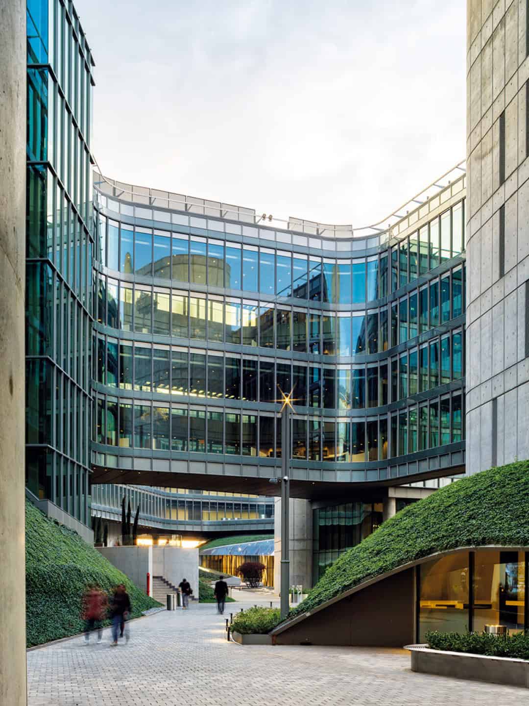 Esneklik ve gün ışığından maksimum faydalanmak, çalışma alanlarının temel kriterlerinden biri olduğu için, ofis alanlarına erişim bir dizi yükseltilmiş avlu aracılığıyla sağlanmaktadır. Bu avlular kullanıcıların dinlenmelerine ve köprüler üzerindeki oturma alanlarında şaşırtıcı güzellikte manzaralar karşısında sosyalleşebilmelerine olanak tanımaktadır.