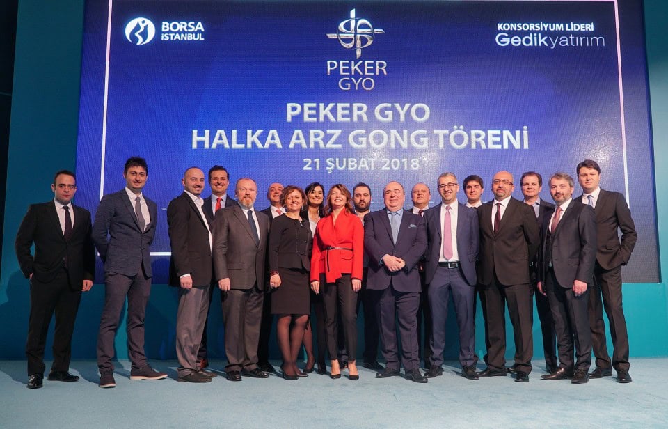 Peker GYO, halka arz sürecinin ardından Borsa İstanbul'da işlem görmeye başladı. PEKGY koduyla işlem görecek olan Peker GYO için bugün gong töreni düzenlendi. Halka arzda, payların yüzde 45'i yurtiçi kurumsal yatırımcılara, yüzde 35'i yurtiçi bireysel yatırımcılara, yüzde 20'si ise yabancı yatırımcılara satılırken şirketin yüzde 32'si halka açılmış oldu.