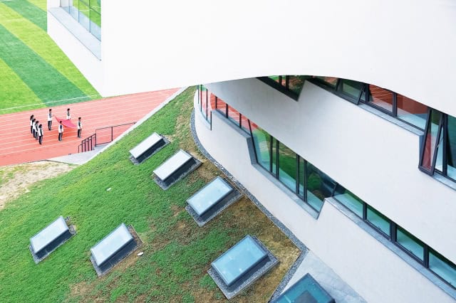 Şehirlerde yaşayan Çinli öğrencilerin günümüzde en elzem ihtiyacı doğa ile dolu, daha açık alanlar olduğu gerçeği; alan kısıtlamaları nedeniyle programları sıralı olarak ayırıp aralarına bahçeler yerleştirme suretiyle birden fazla zemin yaratan dikey bir boyut stratejisi doğurmuş. Ortaya çıkan farklı yollar ile ‘ortada’ birleşen yukarı ve aşağı binaların dizilimi, yeni okulun resmi ve gayri resmi alanları arasındaki ilişkiyi de temsil eden mekânsal bir strateji.