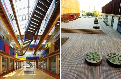Gün ışığına ihtiyaç duymayan mekanlar toprak altında konumlandırılırken, bu mekanların teras çatıları bloklar arasındaki meydanları oluşturdu. Topoğrafyanın bu şekilde kullanılması sayesinde arazi çevresindeki bisiklet ve araç yollarından bu kütlelere bağımsız girişlerle ulaşılabilmesi de mümkün kılındı.