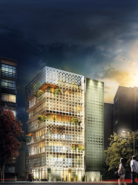 İ.B: Güncel malzemelerden metal mesh kullandığımız bu çiftcidar cephe, bazı yerlerde yırtılarak kat bahçeleri oluşturdu. Ofis kısmının yaşayan kullanımını yeşil ile entegre bir şekilde ortaya çıkarttık. Ayrıca cephede kullanılan doku (pattern) ile aslında içerideki işleyişin güneş ışığı parametreleri ve ofis çalışma standartlarına uygun bir şekilde cepheye birebir yansıdığı bir proje diyebiliriz.
