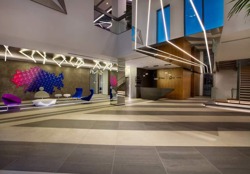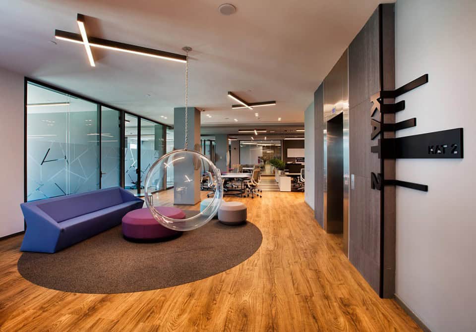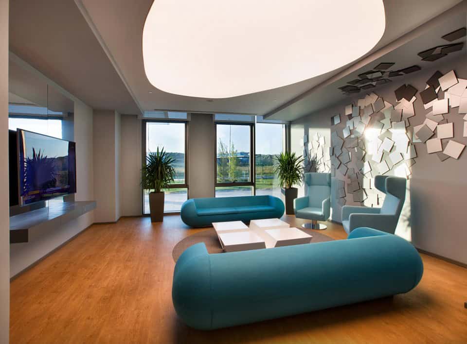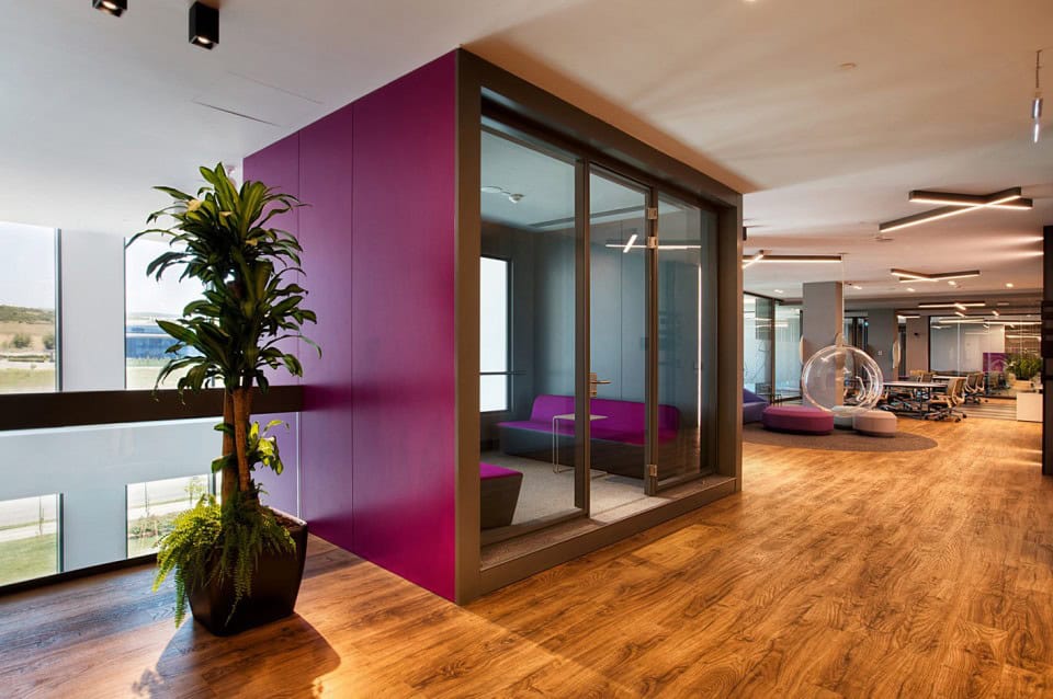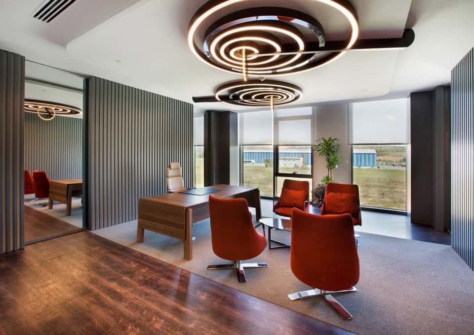 Firmanın kurumsal kimliğinin parçası olan renkler, tasarıma da dinamizmi katan ana etkenlerden. Ağırlıklı olarak iki ana kurumsal rengin farklı ton ve formatta kullanıldığı projede, aydınlık ve ferah bir çalışma ortamı yaratılmış.