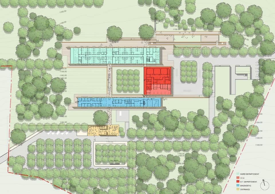 Bina eğimli araziye açılan ve korunaklı yürüyüş yolları ile birbirine bağlanan dört farklı büyüklükte blok şeklindedir. Kalın duvarlar, bölgede hazır olması ve yerel inşaatçılar tarafından kolaylıkla uygulanabildiği için rammed topraktan inşa edilmiştir. Bu yüksek termal kütle özelliklerine sahip,  toprağın kullanılması, sıcaklık ve nemi hastanede sabit tutmaya yardımcı olacaktır.